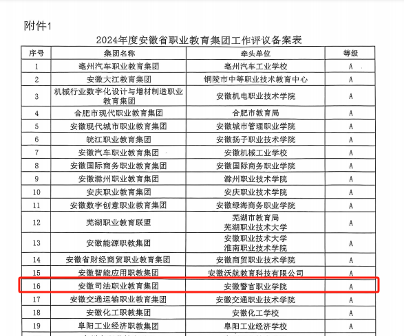 近日,安徽省教育厅、安徽省工业和信息化厅共同发文,学院牵头成立的安徽司法职业教育集团以规范高效的运行管理与显著的建设成效,在全省63家职教集团2024年度工作运行情况综合评价中获评A类职教集团。这是集团继去年获省级示范职业教育集团后,又获评A类职教集团,彰显了在司法职业教育领域的标杆地位。