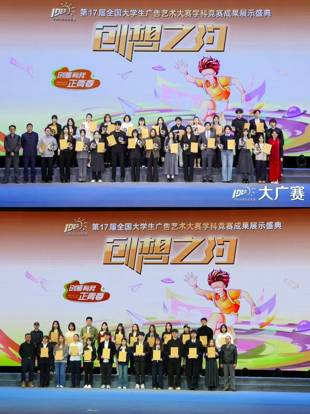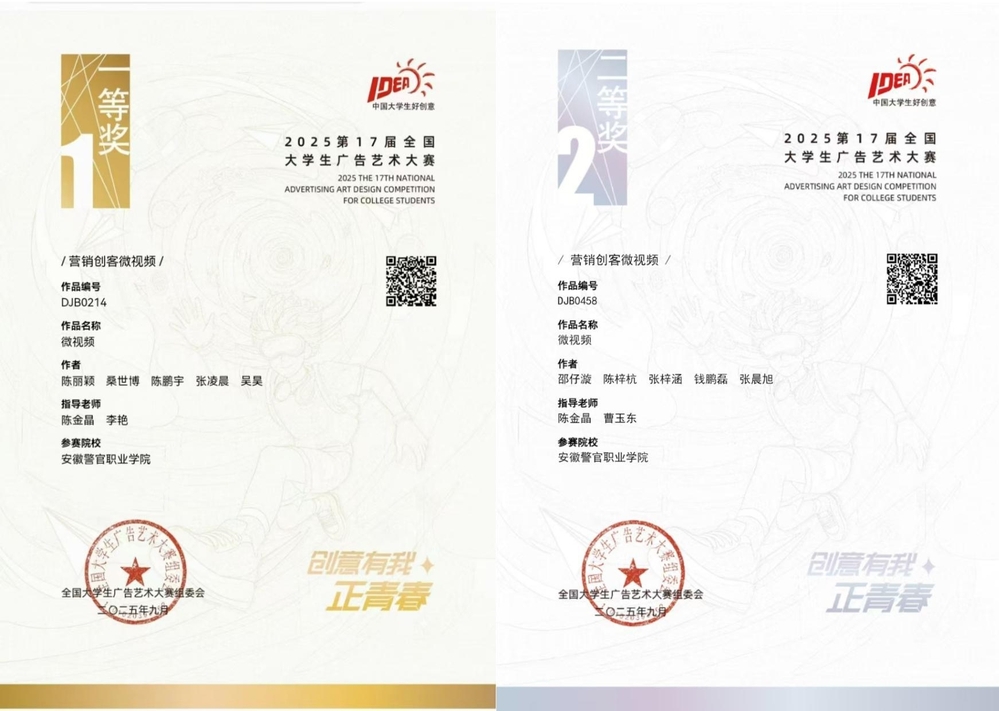12月6日,第17届全国大学生广告艺术大赛学科竞赛成果展示盛典在北京全国政协礼堂隆重举行。在这场年度盛事中,安徽警官职业学院基础部传来捷报,由陈金晶老师指导的学生团队,在竞争异常激烈的营销创客类(微视频)赛道中,成功斩获全国一等奖1项、二等奖1项。