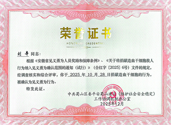 日前,蜀山区委宣传部举办了2025年第四次“蜀山好人”评选会,学院法律二系学子刘辛荣获“蜀山好人”称号,同时经相关部门认定,刘辛同学捐献造血干细胞救人行为属见义勇为。双重荣誉既是对这位青年学子无私奉献的肯定,也展现了新时代警校生的高尚品格与社会担当。