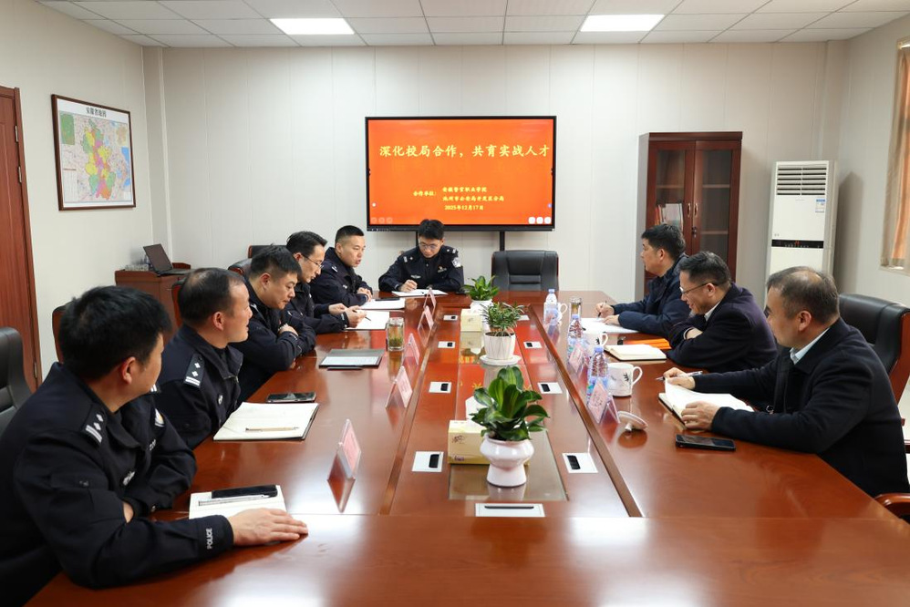 在池州市公安局开发区分局,操申斌亲切慰问了在分局工作的学院毕业生,参观了分局指挥大厅和视频侦查中心,听取了分局负责同志关于池州市经济开发区治安情况、辖区内企业情况及急需人才专业、数量情况,双方围绕“深化校局合作,共育实战人才”主题开展深入交流,在实战人才培养、专业课程开设、学生实习实训等多个方面形成共识。分局高度认可学院毕业生专业素养与责任担当,操申斌对分局支持学院人才培养和学生就业、实习工作表示感谢,希望以本次座谈为契机,在“十五五”时期深化安徽警官职业学院与池州市公安局开发区分局的沟通交流,拓展合作广度和深度,共同推进双方的发展。