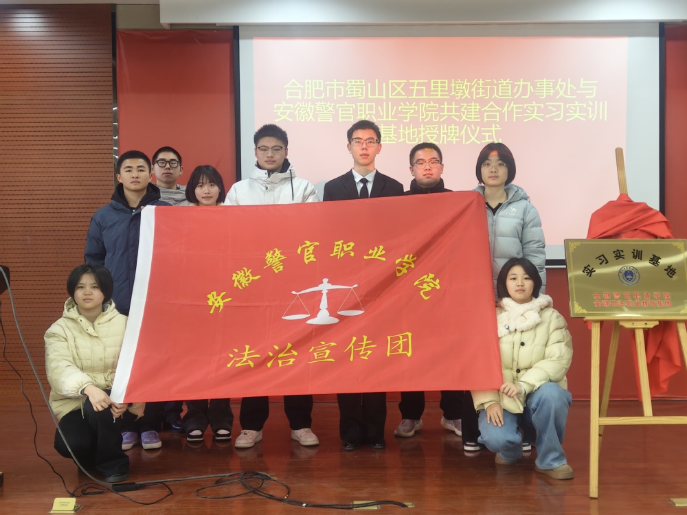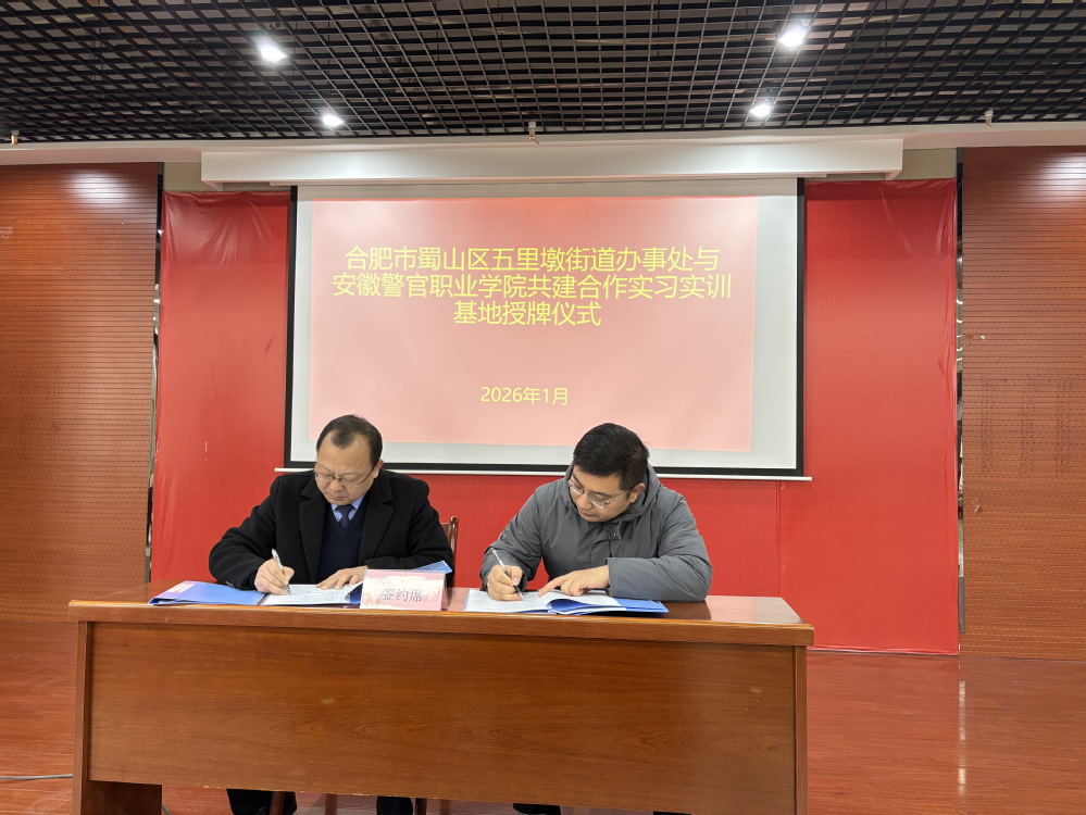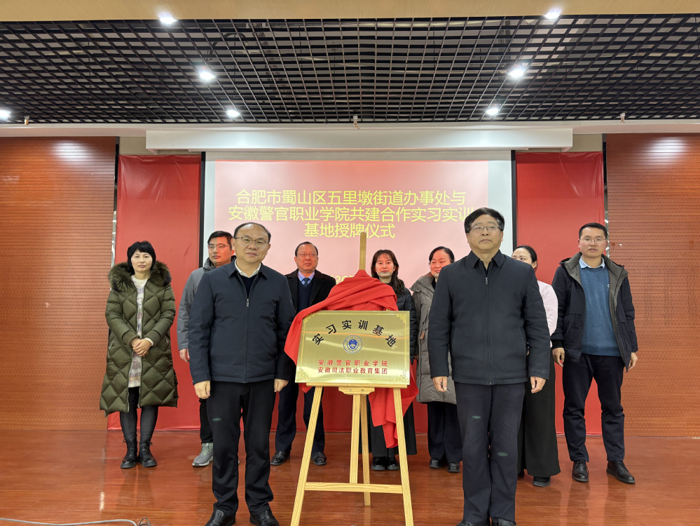 在与会领导和嘉宾的共同见证下,欧元军与张金平一同为安徽警官职业学院五里墩街道实习实训基地揭牌。