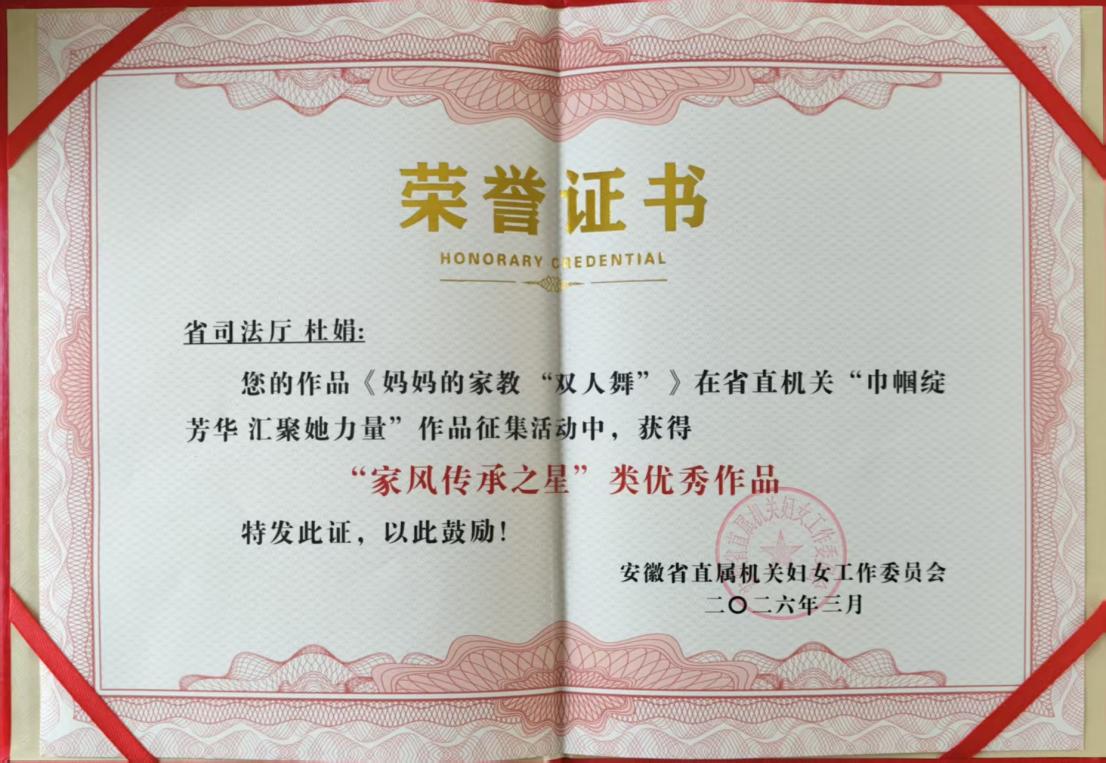 近日,由省直机关妇工委、省直机关工会女职工委员会联合举办的“巾帼绽芳华 汇聚她力量”主题作品征集活动评选结果正式揭晓。安徽警官职业学院选送的作品——《妈妈的家教“双人舞”》在全省多部参赛作品中脱颖而出,荣获“家风传承之星”类优秀作品奖。