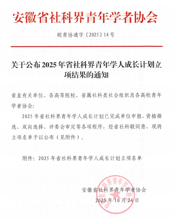 学院五名青年教师获批立项省社科界青年学人成长计划近日,安徽省社科届青年学者协会公布了...