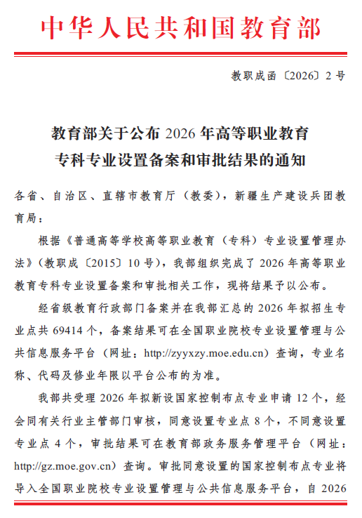 日前,教育部公布了2026年高等职业教育专科专业设置备案和审批结果的通知,我院申报的智能...