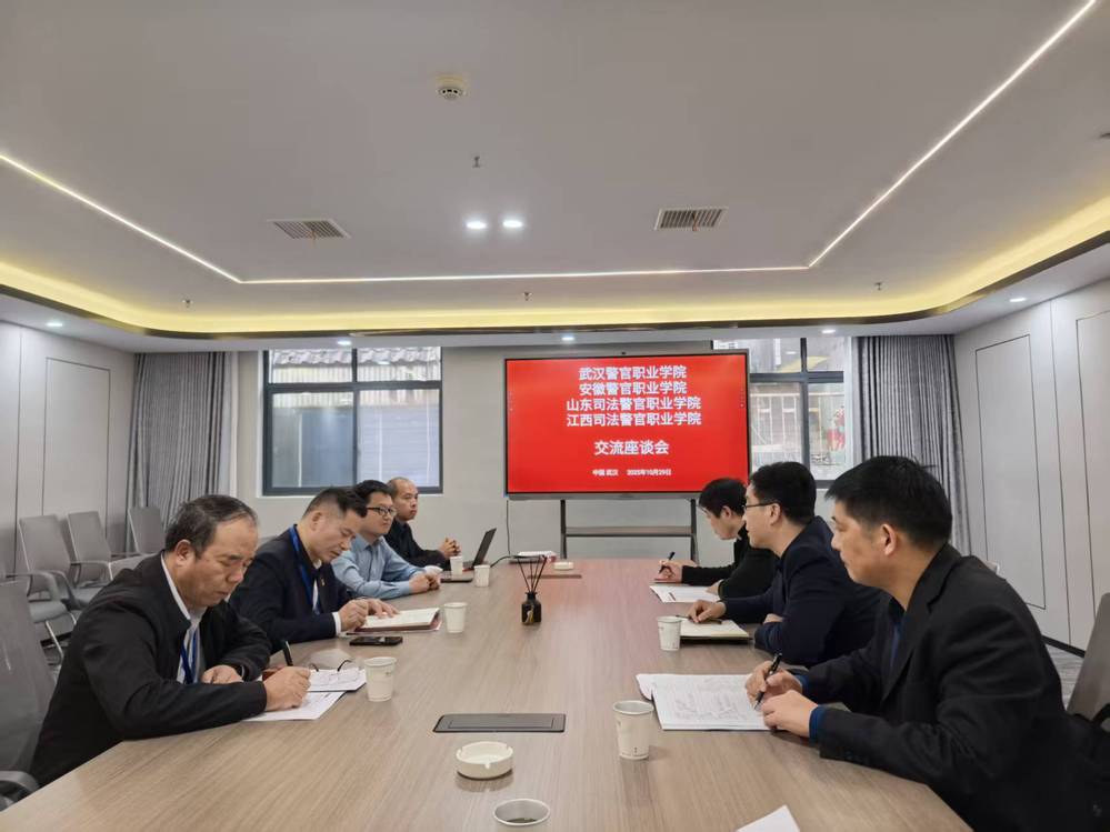 武汉警官职业学院党委委员、副校长李祖义主持召开座谈会。安徽警官职业学院、山东司法警官职业学院、江西司法警官职业学院校领导和相关工作人员参加座谈会。李校长对学院率队到访调研交流表示热烈欢迎,并简要介绍了武汉警院历史、新校区运行、“十五五”规划编制等情况。他希望双方以此次交流为契机,进一步加强两校合作交流,共同助力司法职业教育事业迈上新台阶。