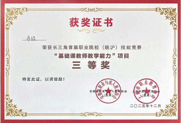 近日,2025年长三角(皖沪)职业教育协同发展研讨会暨长三角(皖沪)职业院校技能展示交流活动落下帷幕,学院共推荐2名教师参加高等职业学校基础课教师语文课程组和信息技术课程组教学能力比赛。本次现场决赛中,语文课程组共有13名教师参赛,信息技术课程组共有15名教师参赛,我校2名参赛教师脱颖而出,分别荣获语文课程组二等奖和信息技术课程组三等奖。