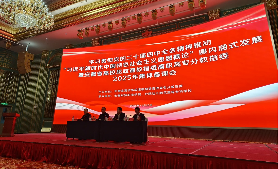 为学习贯彻党的二十届四中全会精神,推动“习近平新时代中国特色社会主义思想概论”课内涵式发展, 11月23日,安徽省高校思政课教指委高职高专分教指委在合肥主办了专题研讨暨集体备课会。全省70余所院校的百余位思政课领域专家、骨干教师到会交流学习。我校马克思主义学院副院长王芸参加了本次会议。