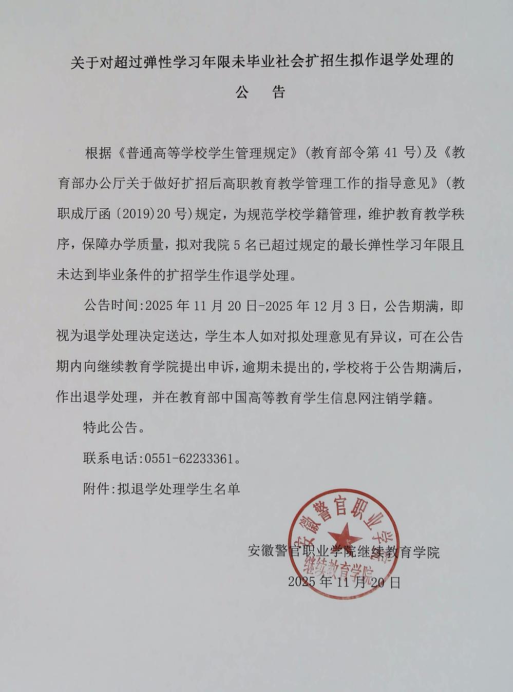 关于对超过弹性学习年限未毕业社会扩招生拟作退学处理的公告