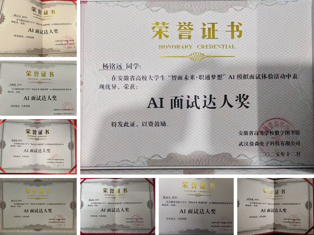 近日,由安徽省高等学校数字图书馆主办、全省高校图书馆协办的“智面未来・职通梦想”AI模拟面试体验活动圆满落幕。我院学子凭借扎实的专业素养、出色的表达能力和良好的应变技巧,在高职高专院校组激烈角逐中脱颖而出,共有8名同学成功跻身全省高职高专院校组前100名,充分展现了我院学子扎实的专业技能和过硬的综合素养。