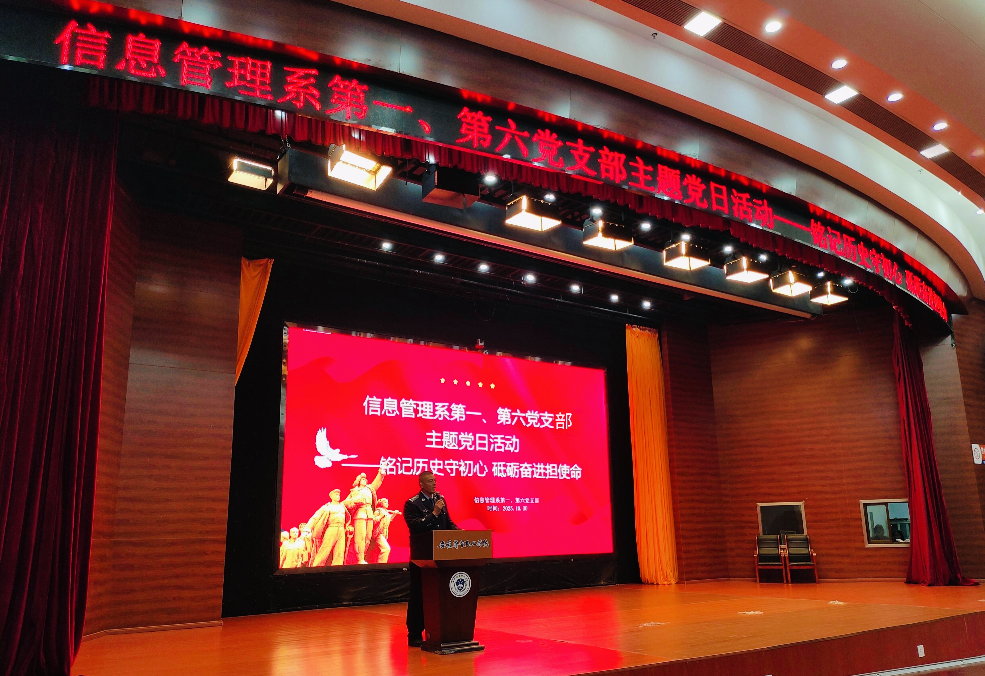 为引导师生铭记历史荣光、传承红色基因,进一步强化党员意识与责任担当,10月30日下午,信息管理系第一、第六党支部在学术报告厅举办“铭记历史守初心 砥砺奋进担使命”主题党日活动。信息管理系第一、第六党支部全体师生党员、预备党员、发展对象及学生骨干共同参与。